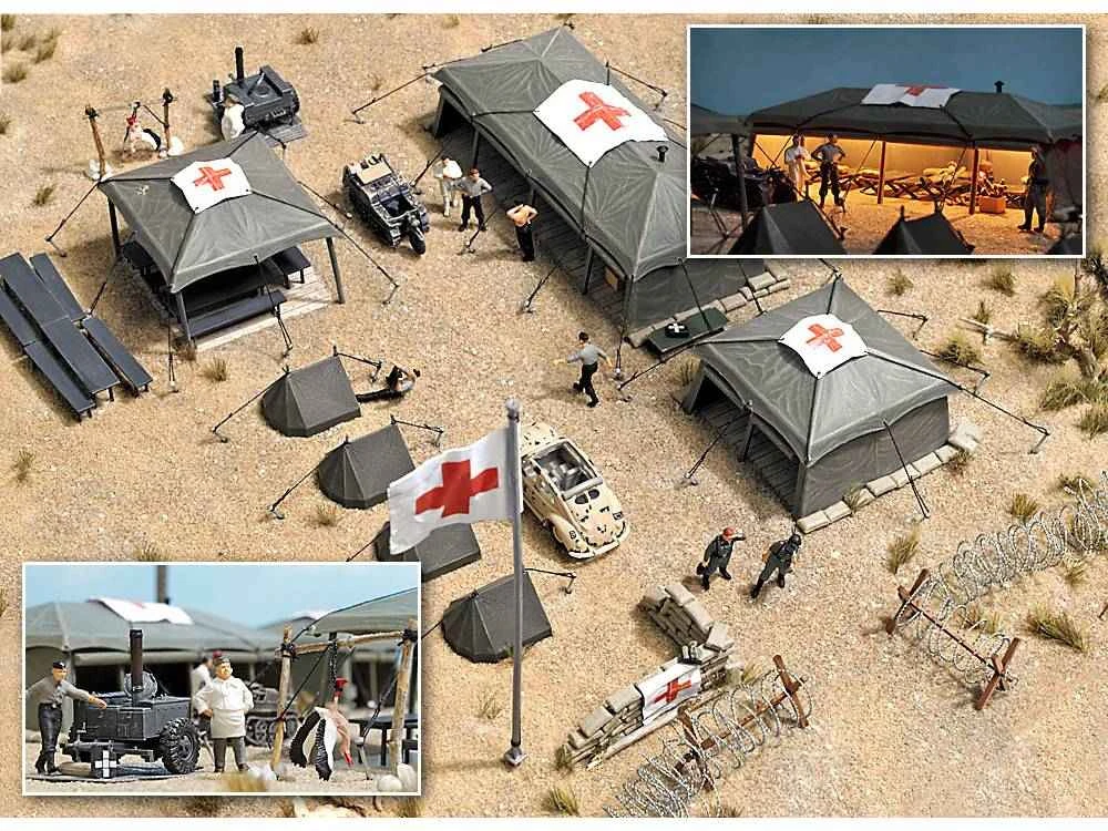 Mit dem Inhalt dieses Bausatzes kann ein komplettes Feldlazarett aufgebaut werden. Mit großem Zelt als Krankenlager, einem Behandlungszelt, einem Verpflegungszelt sowie vier Zweimannzelten (Dackelgarage) zum Übernachten. Weiterhin enthalten: Feldbetten aus echtem Holz, Tische und Sitzgarnituren, Trage, Sandsäcke, Stacheldrahtumzäunung, Holzabsperrungen (Spanische Reiter), Fahnenmast mit Fahne und Feldküche mit Sandblechen. Passende Ergänzung: VW Passat Variant Sanitätsfahrzeug Nr. 5621.