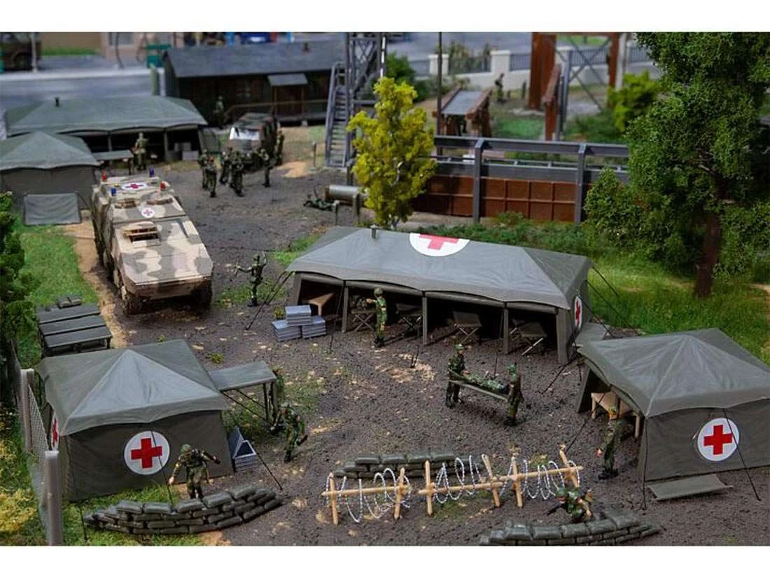 Modell: Spur H0. Ausstattungs-Set mit drei olivgrünen Zelten in unterschiedlichen Größen und mit Rotkreuz-Aufdruck. Feldbetten und Tragen liegen dem Bausatz bei.