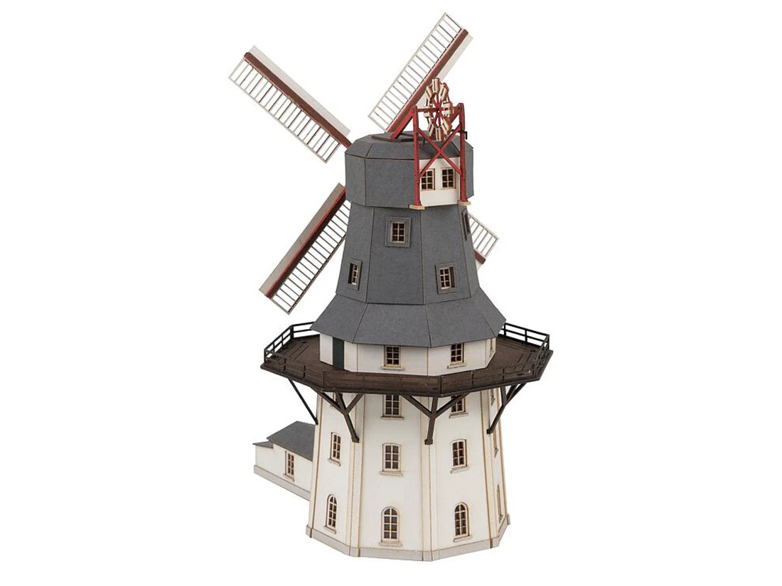 Modell: Spur Z. Holländerwindmühle mit achteckigem Grundriss und einer umlaufenden Galerie mit Geländer nach einem Originalvorbild im Bremer Ortsteil Oberneuland, das heute unter Denkmalschutz steht. Die Mühle kann mit dem Getriebemotor, Art. 180722 (nicht enthalten) betrieben werden.