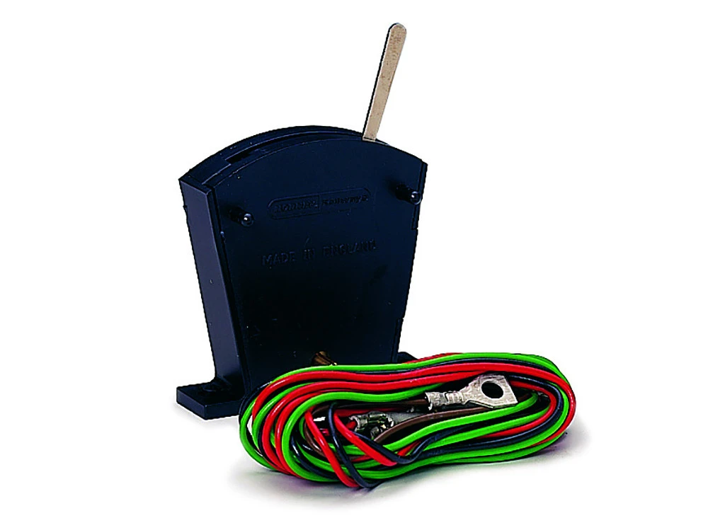 Dieser Weichenmotorschalter in Schwarz liefert den kurzen Stromimpuls, den ein Weichenmotor benötigt. Der Schalter wird auch mit Anschlussdrähten geliefert.