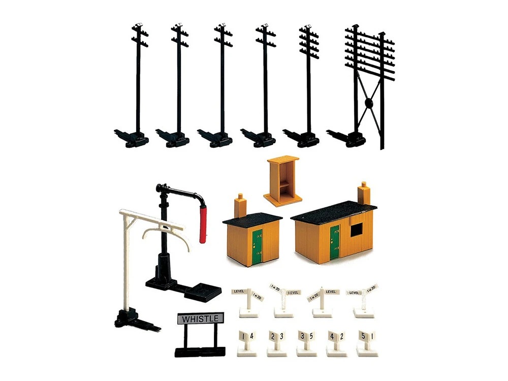 Set mit Masten, kleinen Gebäuden, Schildern, Zubehör.