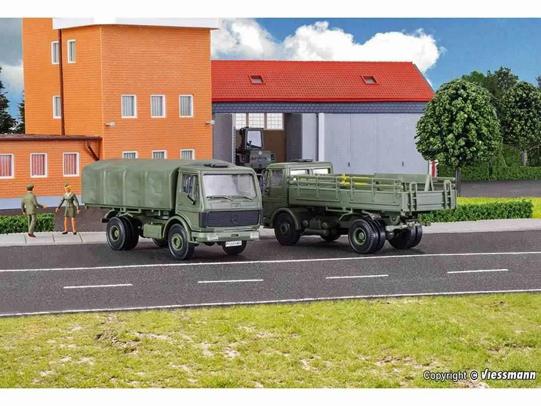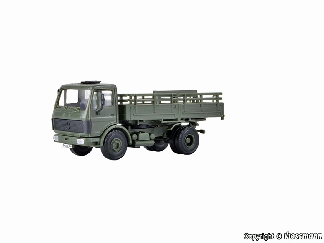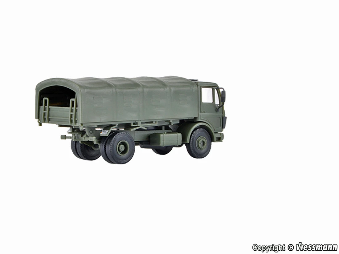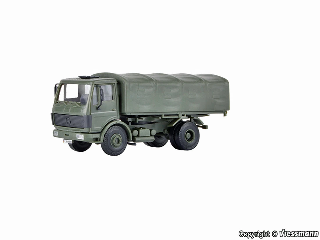 Modell: Spur H0. Bausatz. Im Bausatz sind 2 Fahrzeuge enthalten. Beide können jeweils mit Pritsche oder mit Plane aufgebaut werden. Dieser LKW kommt seit 1977 bis heute bei der Bundeswehr zum Einsatz. Vorbilddaten: Mercedes-Benz, teilmilitarisiert. Lkw 5 t (4Ă2) und (4Ă4). Motorleistung 127 kW/172 PS, Höchstgeschwindigkeit 93 km/h.