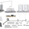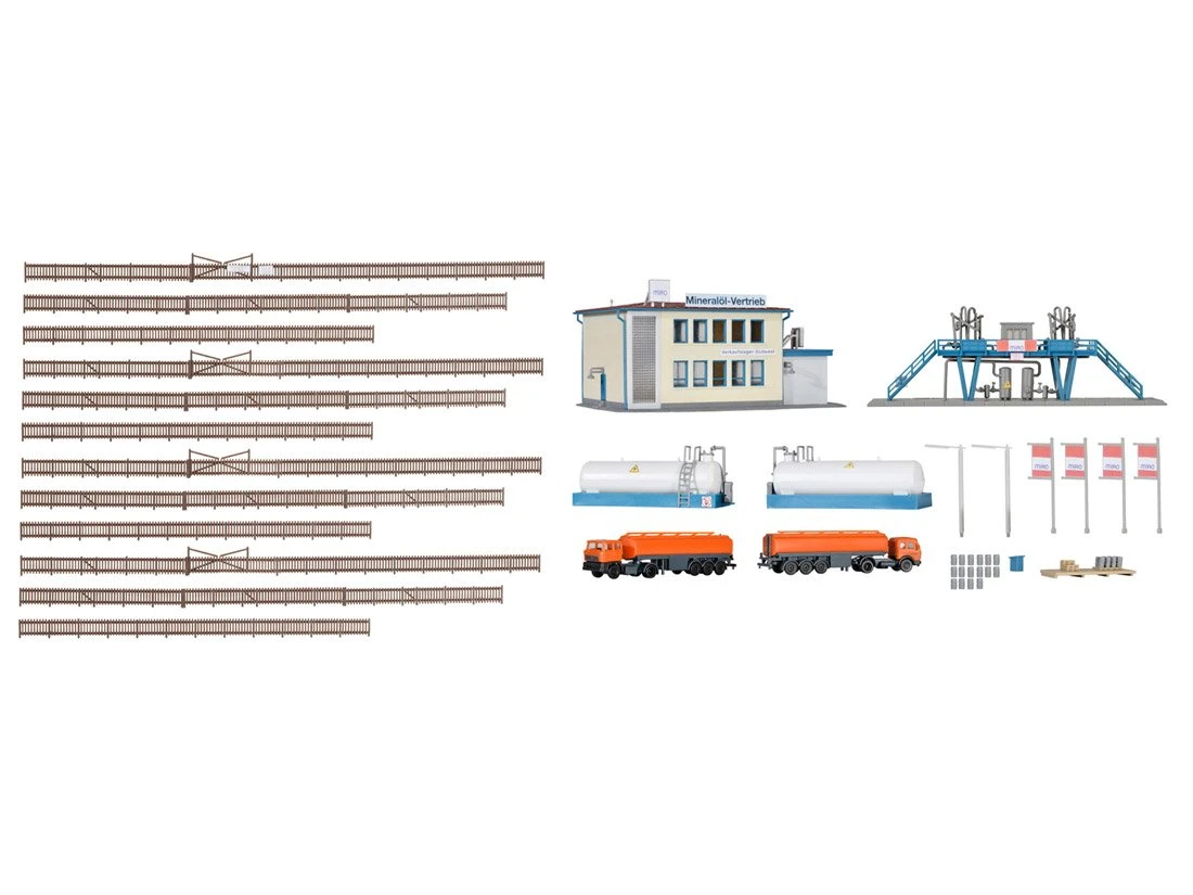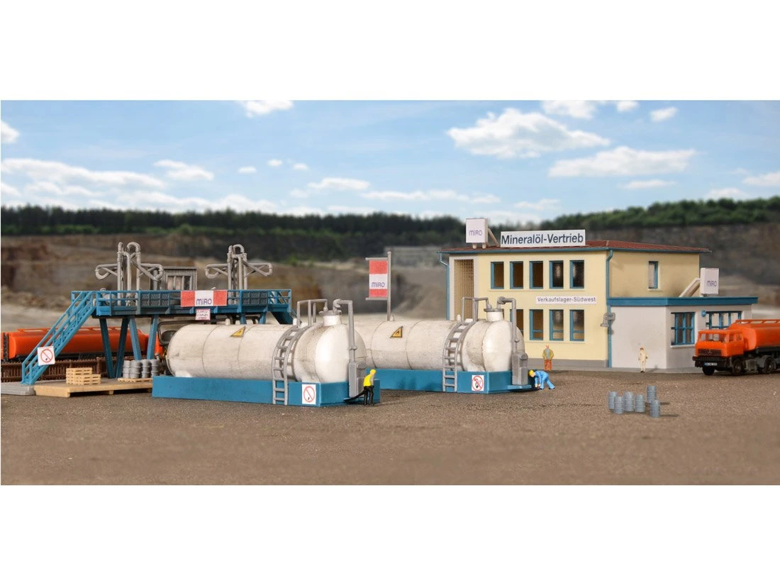 Modell: Spur Z. Bausatz. Der Bausatz enthält das Hauptgebäude, 2 Tanksattelauflieger in oranger Farbgebung der Firma KLETT Mineralöle, 2 Tanks, die Abfüllanlage, Paletten, Fässer, Fahnen und Zäune.