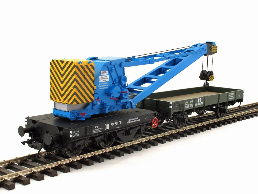 Modell: Spur 0 Gleichstrom. Das Modell nutzt die Möglichkeiten digitaler Steuerung für viele Funktionen wie: Aufbau drehen, Ausleger heben und senken, Haken heben und senken, Gegengewicht verschieben. Eine Verwendung des Kranwagens in einer analogen Umgebung wird nicht unterstützt. Ausgestattet mit Metallradsätzen, Stromabnahme in den Achslagern, Spurkranzhöhe kleiner 1,2mm, automatische Kupplung mit Kurzkupplungskulisse, Kupplungsnormschacht, Federpuffer, mit originaler Schraubenkupplung nachrüstbar, dunkel vernickelte Radsätze.