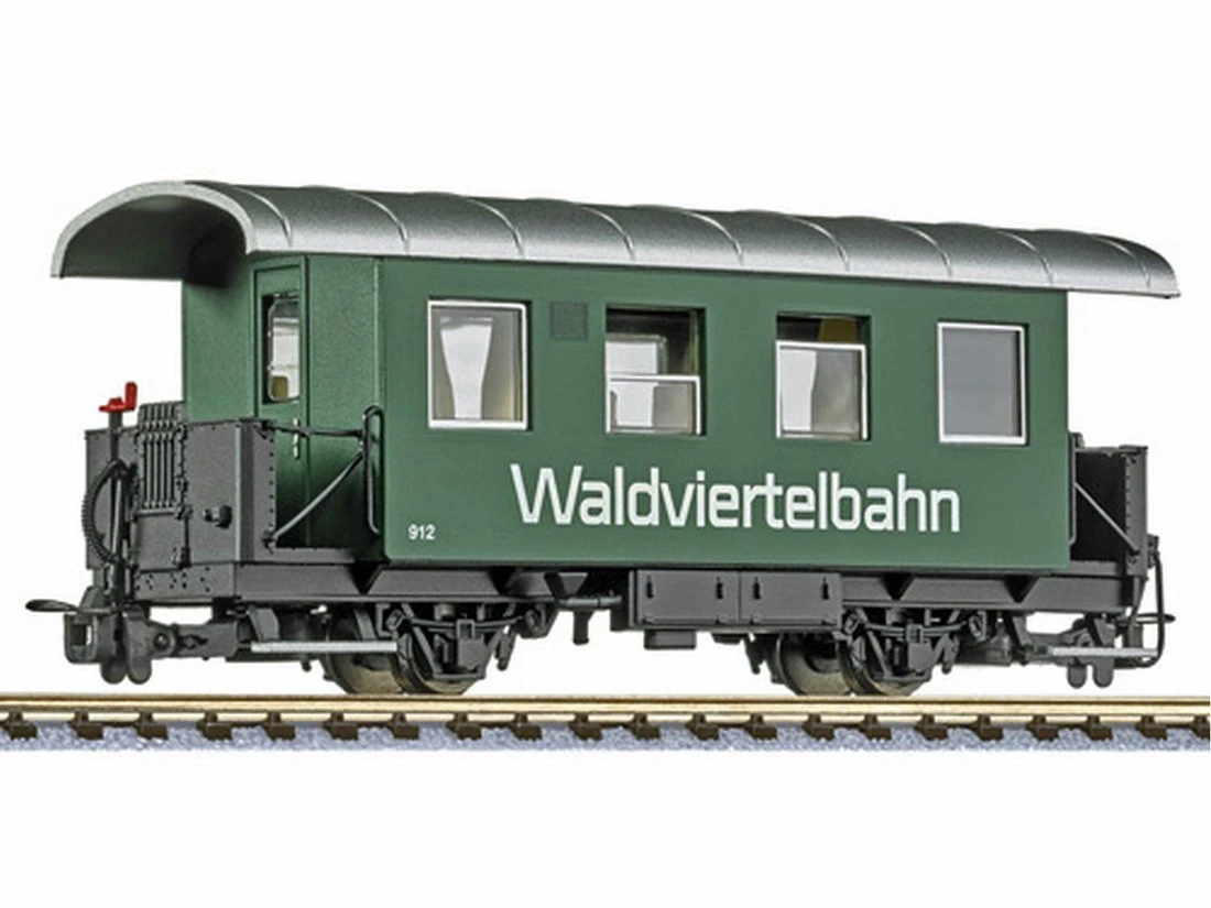 Modell: Spur H0e Gleichstrom. Personenwagen der Waldviertelbahn. Wagen mit neuem,filigranem Bühnengeländer.
