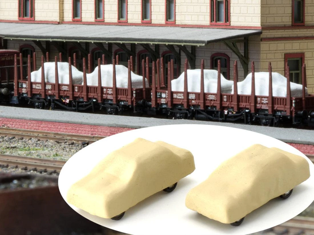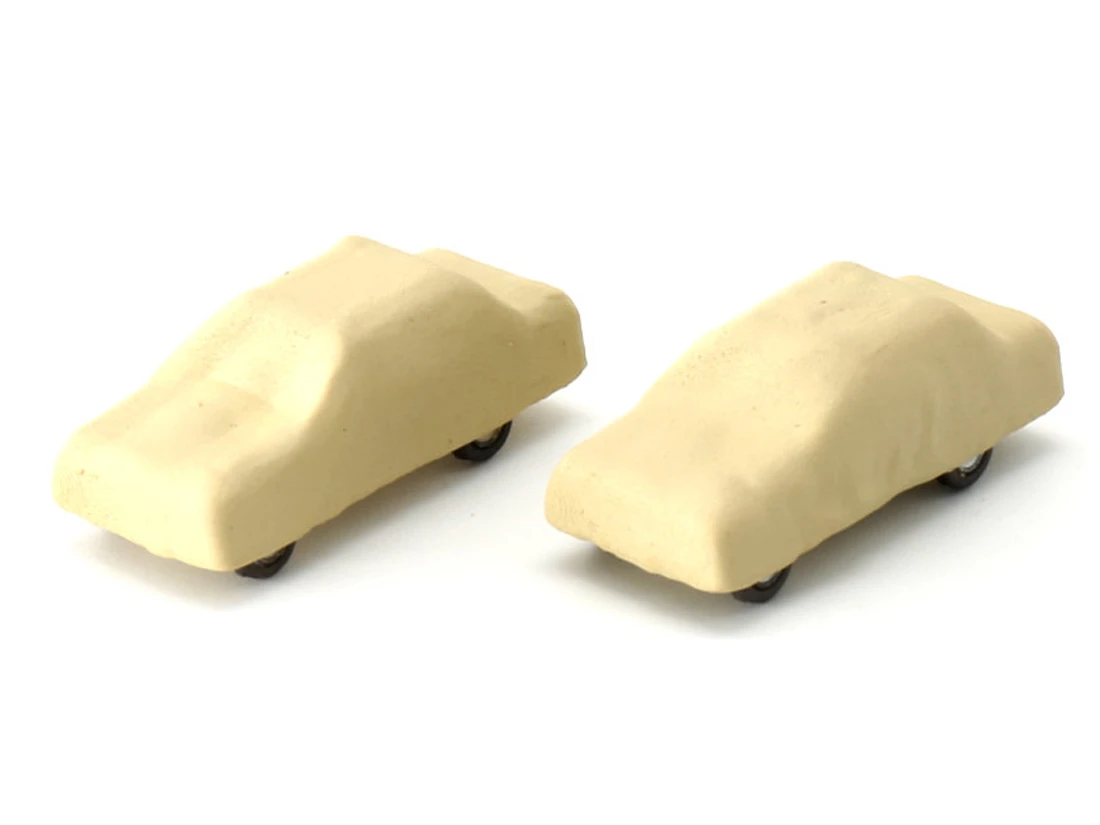 Modell: Spur TT. Zwei PKW unter Plane, Version 1, Fertigmodell bemalt.