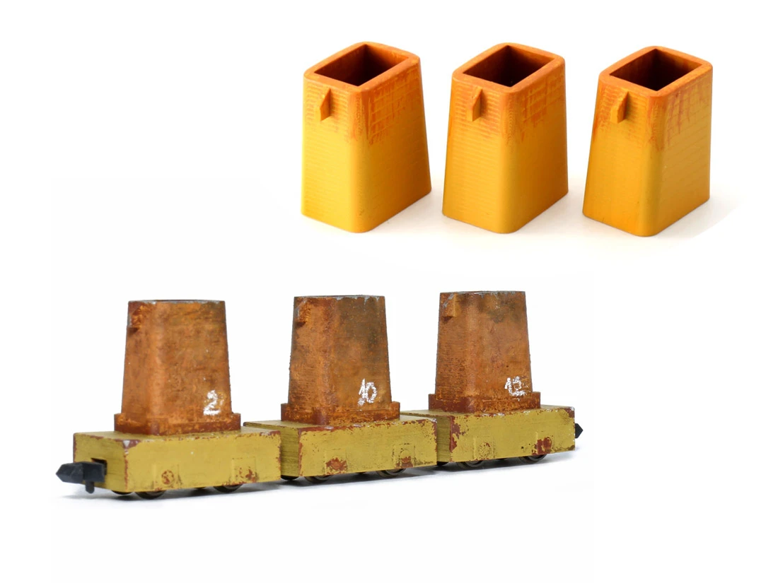 Modell: Spur TT. Drei Kokillen, Fertigmodell bemalt. Kokillen sind wiederverwendbare Formen, die in Stahlwerken zum GieĂen von Metallblöcken verwendet werden.