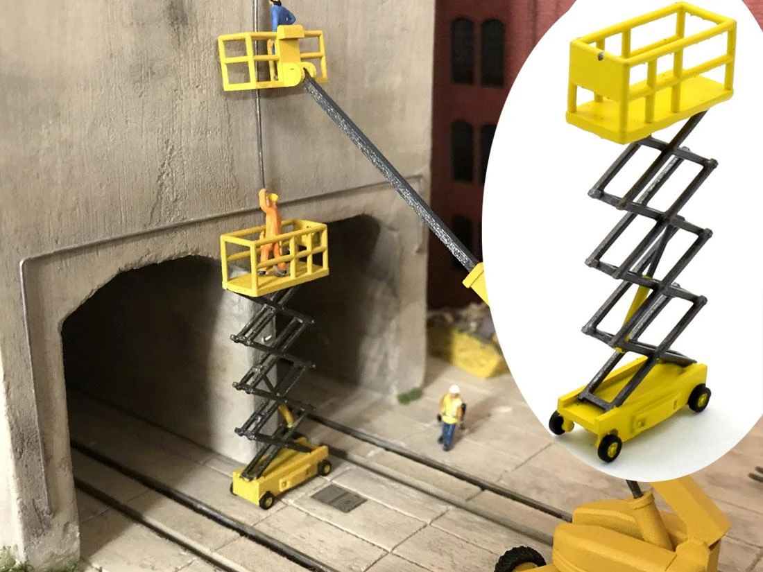 Modell: Spur TT. Eine ausgefahrene Scherenarbeitsbühne, Fertigmodell aus Kunststoff, bemalt.