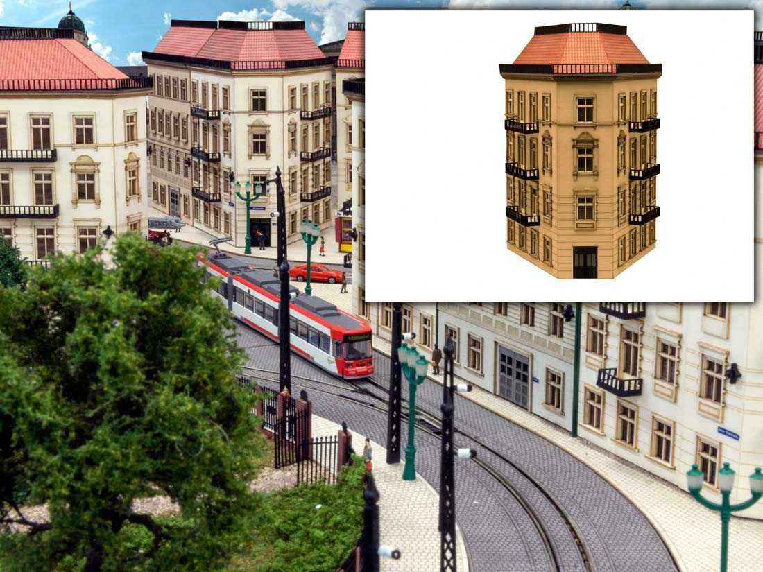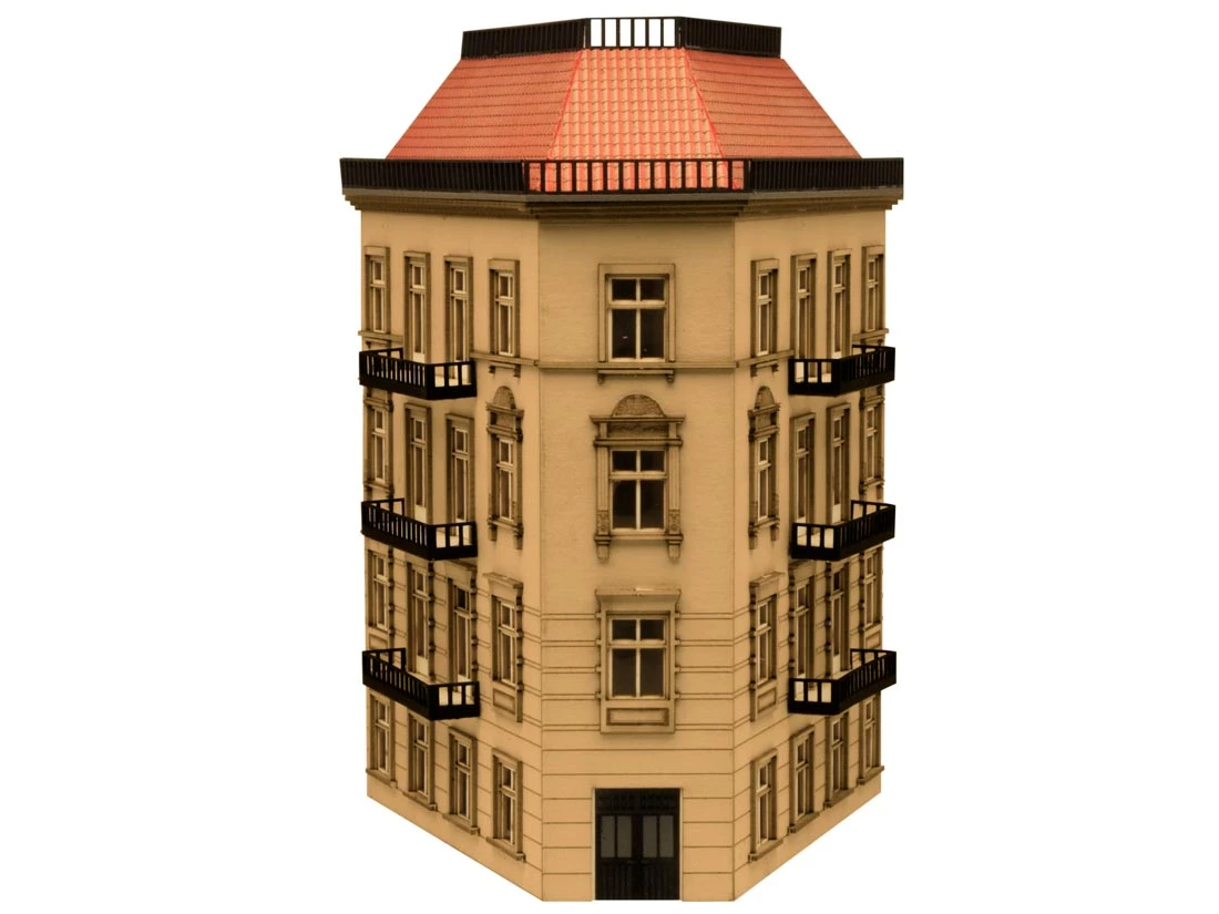 Modell: Spur TT. Halbrelief Stadthaus im Stil der Gründerzeit. In dieser Epoche wurden die Häuser meist einheitlich gebaut, wobei nur die Fassaden unterschiedlich ausgeführt wurden. Das Haus ist in 4 Ebenen unterteilt und mit einer Zwischenwand je Etage versehen. Die Fassade ist aufwendig graviert und hat viele schöne Details. Alle Häuser dieser Serie können miteinander verbunden werden, wodurch der Bau kompletter Straßenzüge ermöglicht wird.