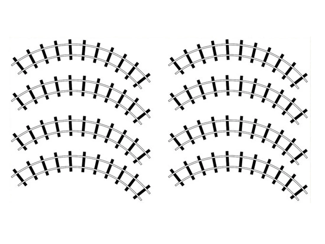 Spur TT. Set mit 8 gebogenen Schienen. Kunststoffmodell, unbemalt. Keine elektrische Funktion oder beweglichen Teile. Spurweite 5mm, basierend auf einer Vorbildspurweite von 600mm.