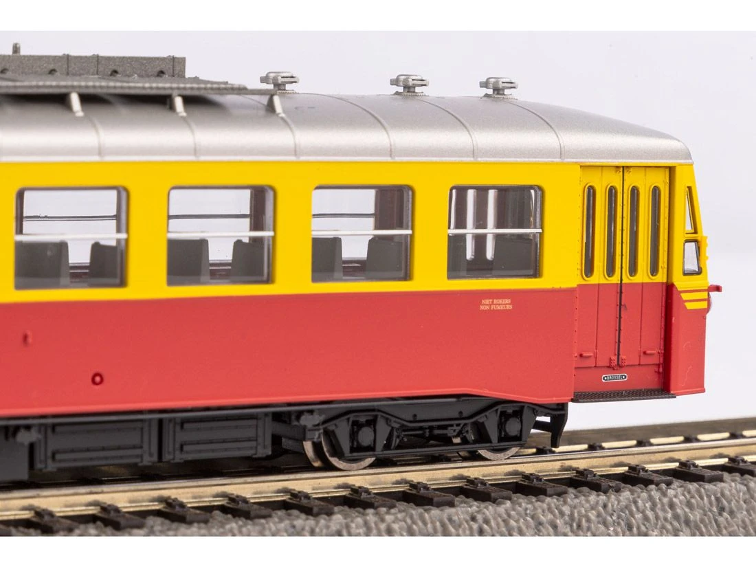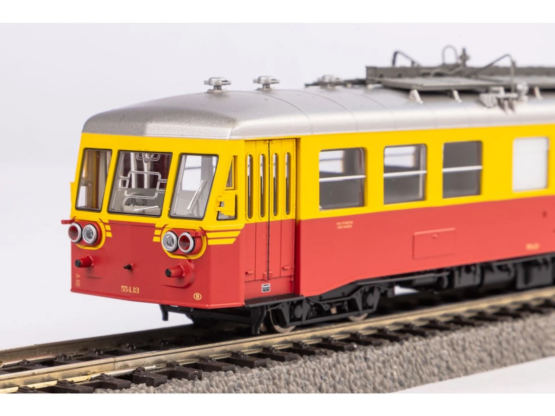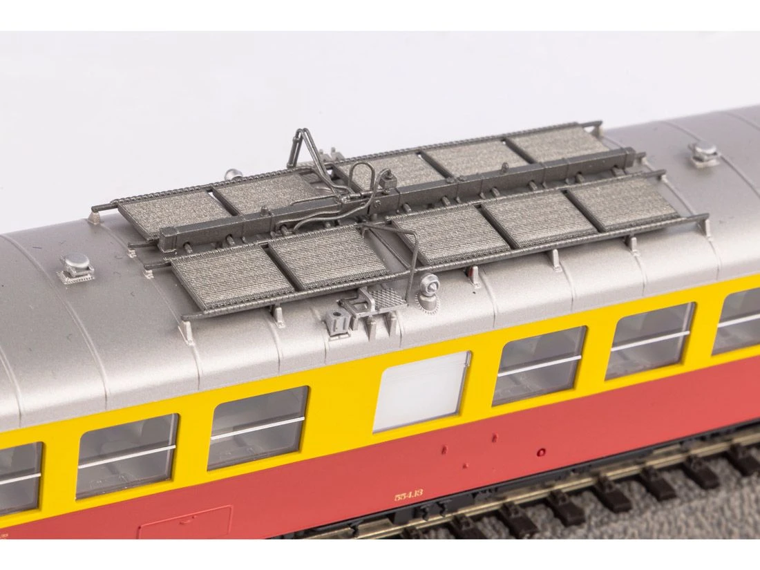 Modell: Spur H0 Gleichstrom. Druckvariante der Rh 554 der SNCB in Epoche III. Ausgestattet mit fein gravierten Formen an Wagenkasten, Wagenboden und Drehgestellen und mit vielen angesetzten Details im Dachbereich. Angetrieben wird das Modell von einem Motor, der so dimensioniert ist, dass ein freier Blick durch die vielen Fenster besteht. Zwei Achsen des Modells sind angetrieben, die Stromabnahme erfolgt ĂŒber alle vier Achsen.