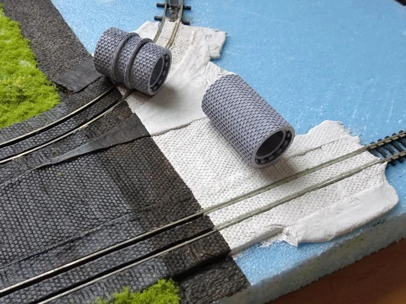 Mit dieser Railnscale Innovation können Sie ganz einfach individuelle Steinpflasterstraßen und Straßenbahnschienen (Reihenverband fein mit Randeinfassung und Innenschiene) erstellen. Zum Prägen der Struktur rollen Sie die Walzen über die ausgerollte Modelliermasse. Wir empfehlen dazu die lufttrocknende DAS Modelliermasse.