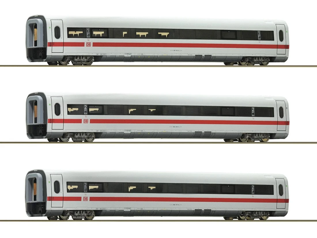 Modell: Spur H0 Gleichstrom. ErgÀnzungsset 3 mit drei Zwischenwagen zum ICE-1-Triebzug der Deutschen Bahn, bestehend aus einem Wagen 1. Klasse, Gattung Avmz 801.0, einem Wagen 2. Klasse, Gattung Bvmz 802.3 und einem Wagen 2. Klasse, Gattung Bvmz 802.6.