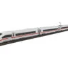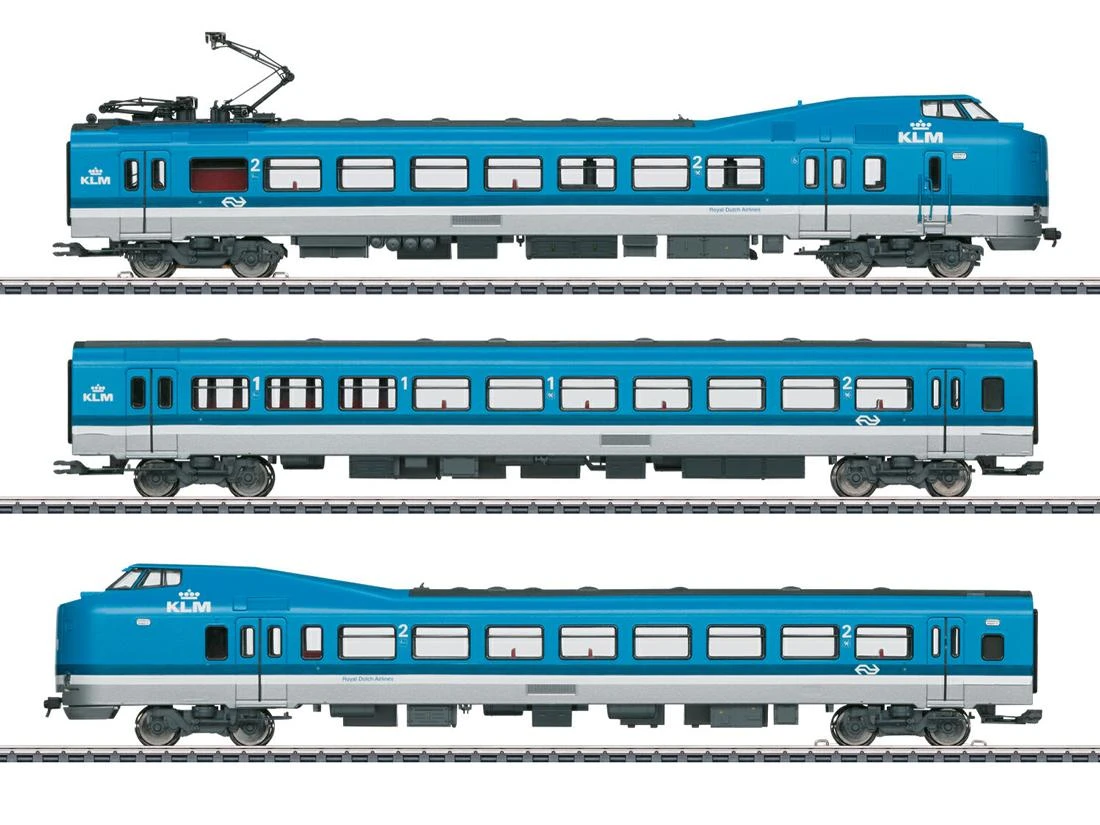Modell: Spur H0 Gleichstrom. Dreiteiliger Elektro-Triebzug als Intercity Triebzug Baureihe ICM-1 „Koploper“ der Niederländischen Eisenbahnen (NS). Ausführung in KLM-Gestaltung. 1 Motorwagen als Endwagen mBk 2. Klasse, 1 Mittelwagen AB 1./2. Klasse, 1 Steuerwagen als Endwagen sBk 2. Klasse. Triebzug-Betriebsnummer 4011. Betriebszustand um 1986/87. Mit Digital-Decoder mfx+ und umfangreichen Geräuschfunktionen. 3-teilige Ausführung. Fahrgestell beim motorisierten Endwagen aus Druckguss. Geregelter Hochleistungsantrieb mit Schwungmasse. 2 Achsen in einem Drehgestell angetrieben. Haftreifen. Führerstände in den beiden Endwagen mit Inneneinrichtung. Fahrtrichtungsabhängige Stromversorgung über den jeweils vorderen Triebkopf. Spezial-Kurzkupplungen mit Kulissenführung. Serienmäßig eingebaute Innenbeleuchtung. Fahrtrichtungsabhängig wechselndes Dreilicht-Spitzensignal und 2 rote Schlusslichter sowie Innenbeleuchtung konventionell in Betrieb, digital schaltbar. Spitzensignal an Endwagenseite 2 und 1 jeweils digital separat abschaltbar. Spitzensignal mit vorbildgerechten leicht gelben und roten Leuchtdioden (LED). Innenbeleuchtungen mit warmweißen LED. Detaillierte Ausführung von Fahrwerk und Aufbau. An den Endwagen Darstellung der „Scharfenberg“-Kupplung mit Abdeckung. Für Doppeltraktion liegt eine zusätzliche starre Kupplungsverbindung bei. Im Serienzustand Ausführung der Endwagen mit geschlossenen Übergangstüren. Darstellung der an einem Endwagen zur Seite geschobenen Schwenktüren mit Faltenbalg ist mit beigelegtem Einsteckteil möglich.